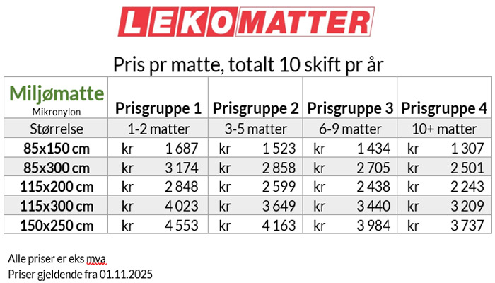 Nedenfor viser vi pris pr år pr matte for 2 av våre mest populære løsninger, Leko Entre Plus (nylonmatter)med 20 skift pr år og 10 skift pr år,samt Leko Miljømatte (mikronylon med mer stoff) med 20 og10 skift pr år. Ta kontakt oss om du har noen spørsmål eller ønsker tilbud på andre byttefrekvenser. Ønsker du et konkret tilbud tilpasset ditt behov, kontakt oss på post@leko.no benytt skjema for prisforespørsel eller ring oss på telefon 22 35 80 35.
